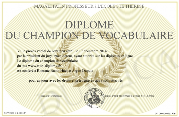 Envoyez par email votre Diplôme du champion de vocabulaire personalisé