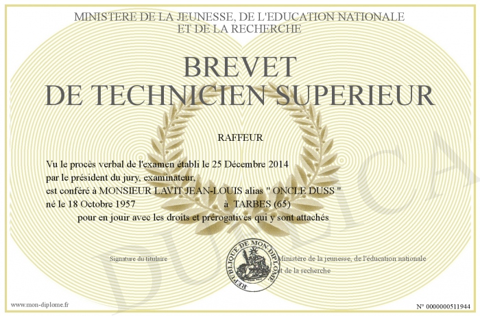 Envoyez par email votre BREVET DE TECHNICIEN SUPERIEUR personalisé