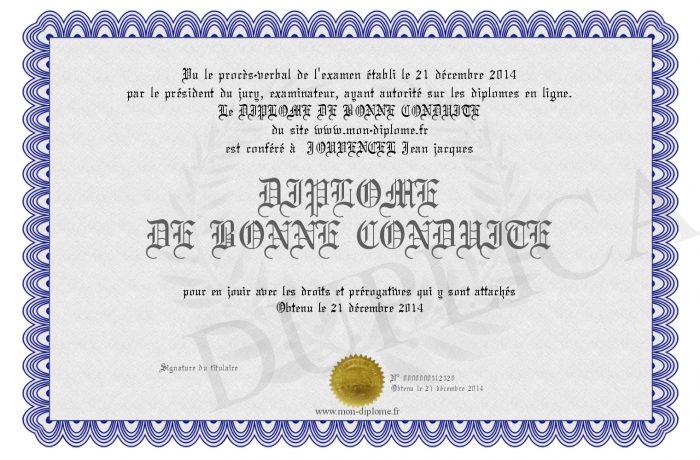 Envoyez par email votre DIPLOME DE BONNE CONDUITE personalisé