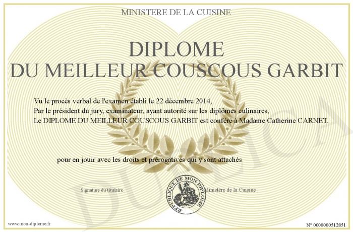 Envoyez par email votre DIPLOME DU MEILLEUR COUSCOUS GARBIT personalisé