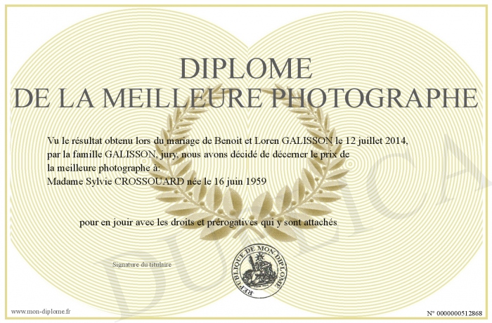 Envoyez par email votre Diplôme de la meilleure photographe personalisé