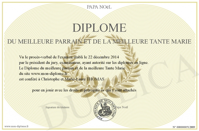 Envoyez par email votre Diplôme du meilleure parrain et de la meilleure Tante Marie personalisé