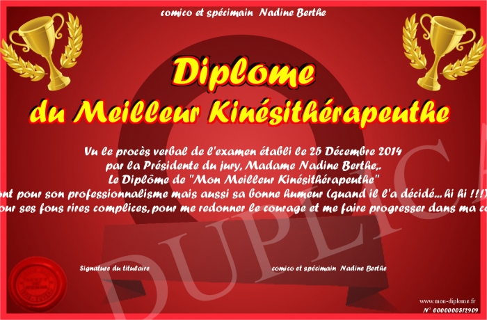 Envoyez par email votre Diplôme du Meilleur Kinésithérapeuthe personalisé