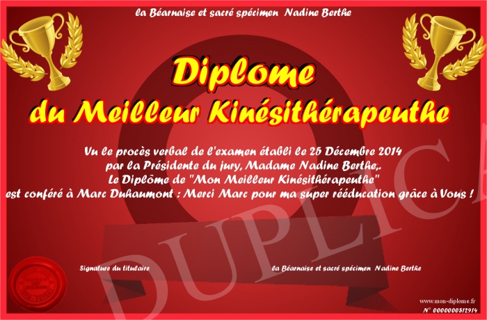 Envoyez par email votre Diplôme du Meilleur Kinésithérapeuthe personalisé
