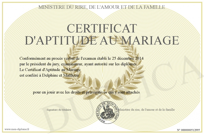 Envoyez par email votre Certificat d'Aptitude au Mariage personalisé