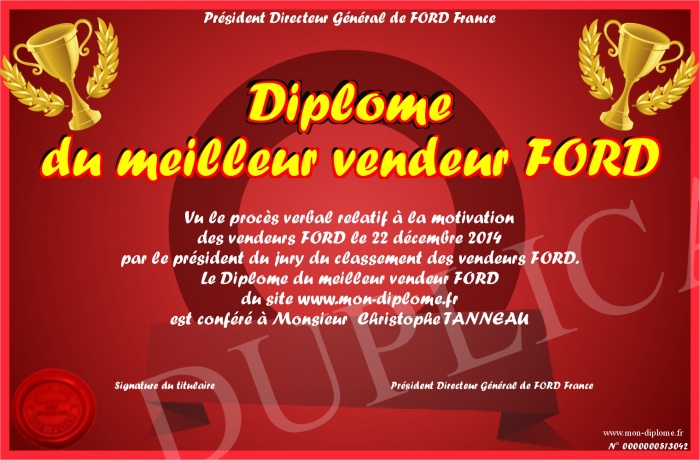 Envoyez par email votre Diplôme du meilleur vendeur FORD personalisé