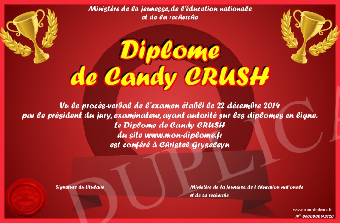 Envoyez par email votre Diplôme de Candy CRUSH personalisé