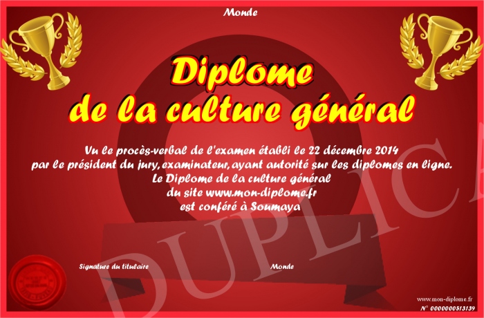 Envoyez par email votre Diplôme de la culture général personalisé