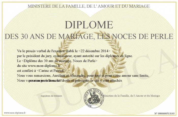Envoyez par email votre Diplôme des 30 ans de mariage, les Noces de Perle personalisé