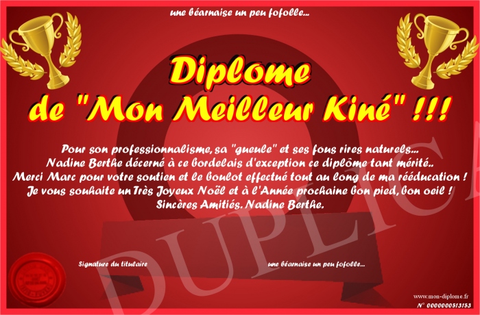 Envoyez par email votre Diplôme de -Mon Meilleur Kiné- !!! personalisé
