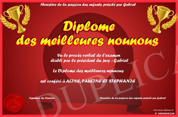 Envoyez par email votre Diplôme des meilleures nounous personalisé