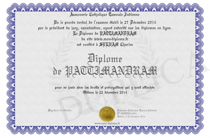 Envoyez par email votre Diplôme de PATTIMANDRAM personalisé