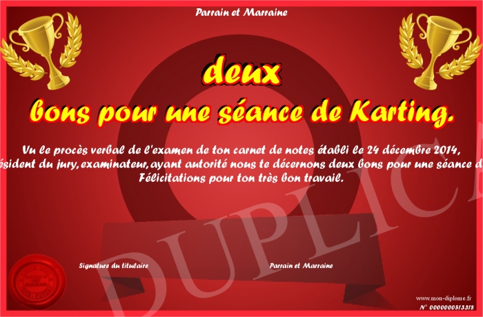 Envoyez par email votre deux bons pour une séance de Karting. personalisé