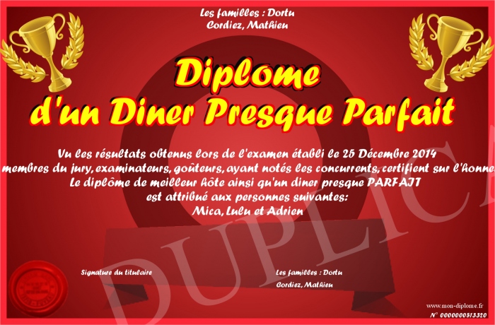 Envoyez par email votre Diplôme d'un Diner Presque Parfait personalisé