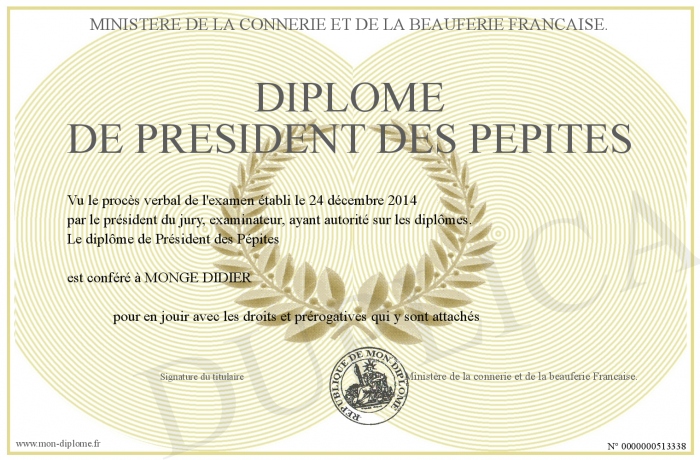 Envoyez par email votre Diplôme de Président des Pépites personalisé