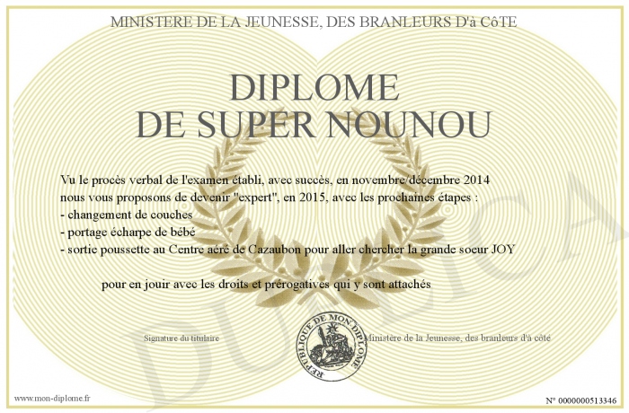 Envoyez par email votre Diplôme de Super Nounou personalisé