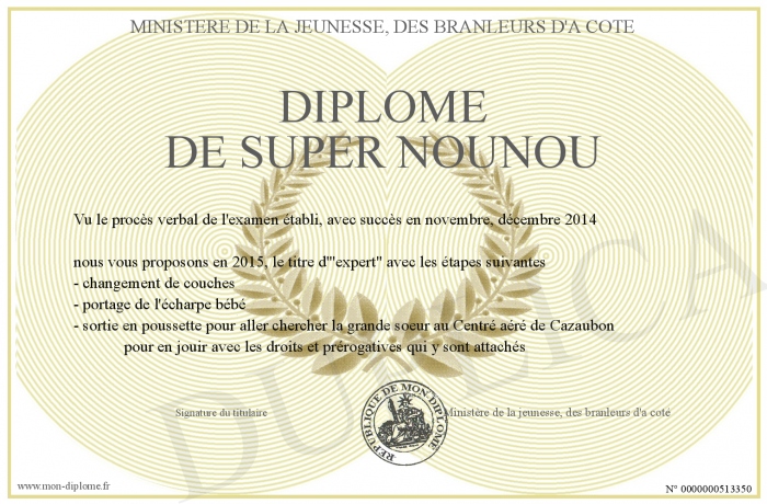 Envoyez par email votre Diplôme de Super Nounou personalisé