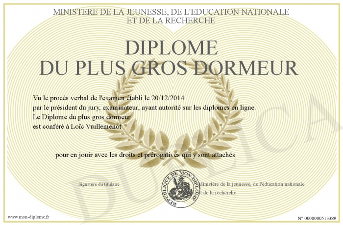 Envoyez par email votre Diplôme du plus gros dormeur personalisé