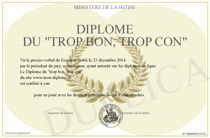 Envoyez par email votre Diplôme du -trop bon, trop con- personalisé