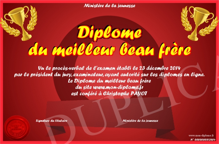 Envoyez par email votre Diplôme du meilleur beau frère personalisé