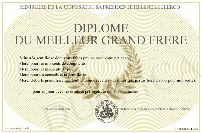 Envoyez par email votre Diplôme du meilleur grand frere personalisé