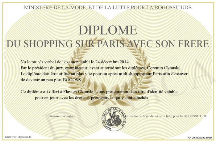 Envoyez par email votre Diplôme du shopping sur Paris avec son frère personalisé
