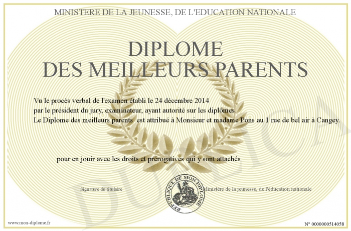 Envoyez par email votre Diplôme des meilleurs parents personalisé