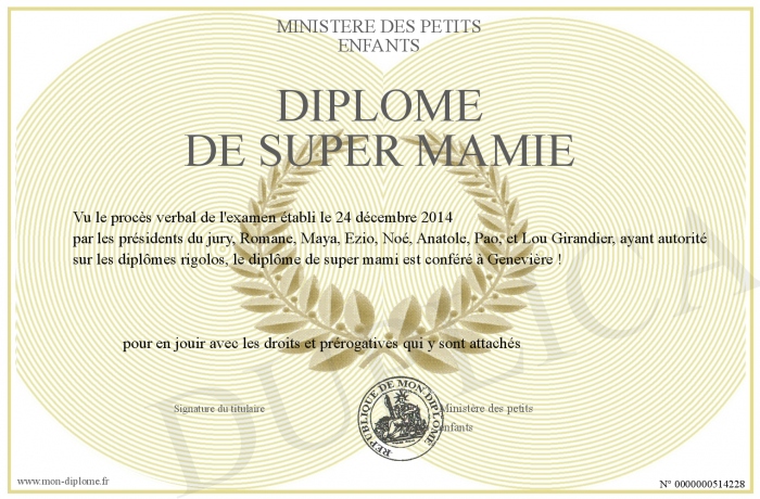 Envoyez par email votre Diplôme de super Mamie personalisé