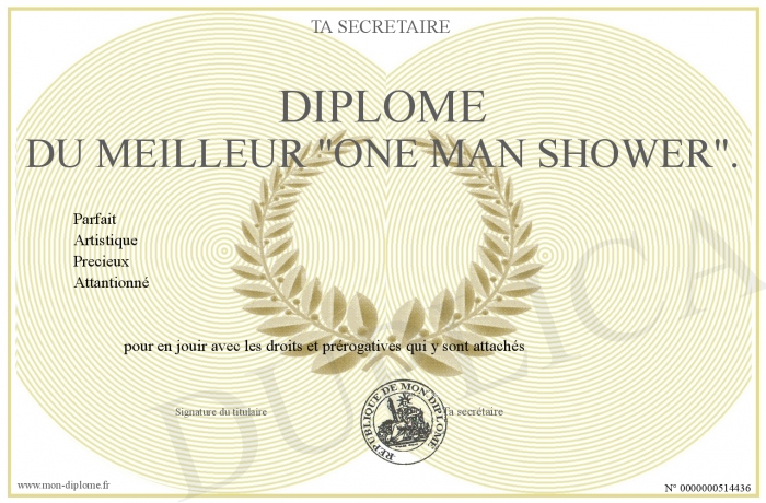 Envoyez par email votre Diplôme du meilleur -one man shower-. personalisé