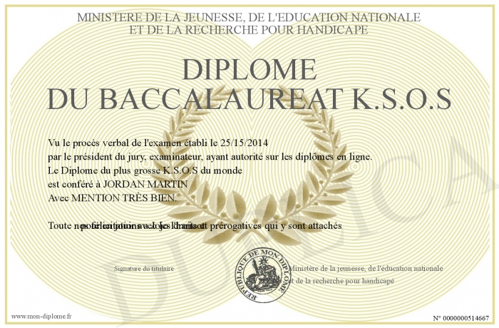 Envoyez par email votre Diplôme du baccalaureat K.S.O.S personalisé