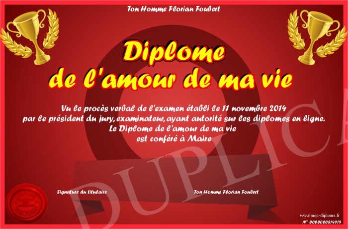 Envoyez par email votre Diplôme de l'amour de ma vie personalisé