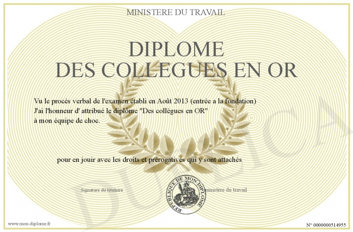 Envoyez par email votre Diplôme des collègues en OR personalisé