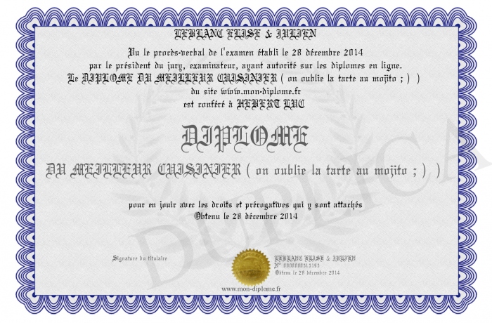 Envoyez par email votre DIPLOME DU MEILLEUR CUISINIER ( on oublie la tarte au mojito ; ) ) personalisé