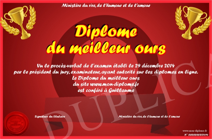 Envoyez par email votre Diplome du meilleur ours personalisé