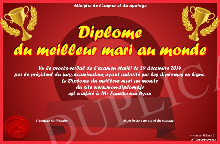 Envoyez par email votre Diplôme du meilleur mari au monde personalisé