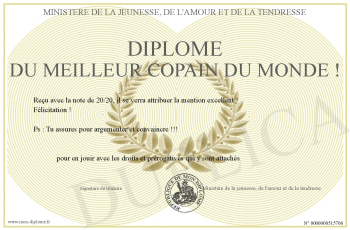 Envoyez par email votre Diplôme du meilleur copain du monde ! personalisé