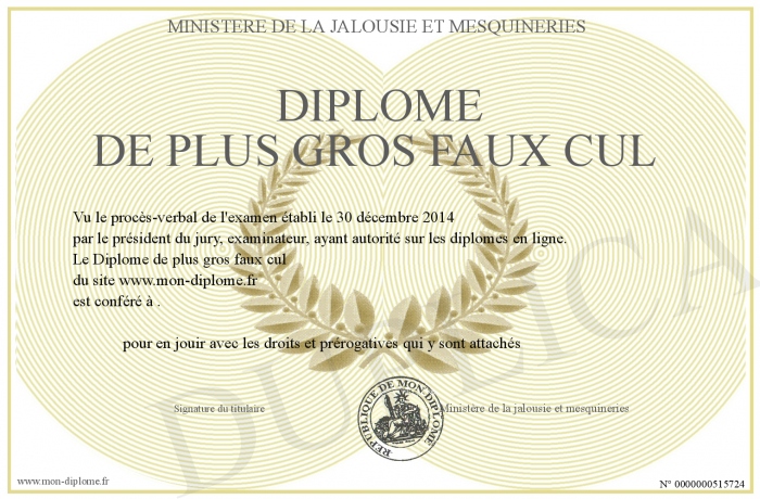 Envoyez par email votre Diplôme de plus gros faux cul personalisé
