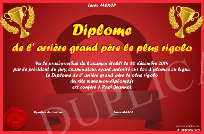 Envoyez par email votre Diplôme de l' arrière grand père le plus rigolo personalisé