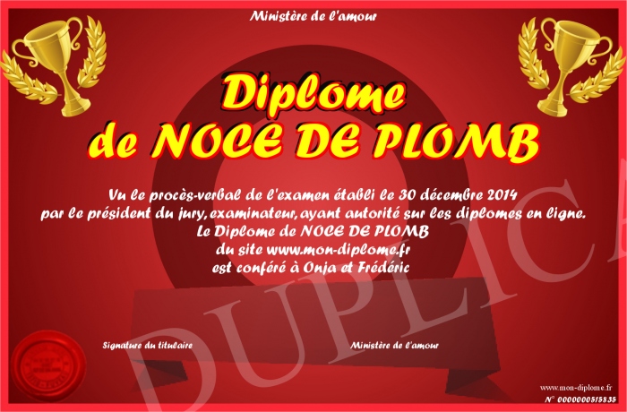 Envoyez par email votre Diplôme de NOCE DE PLOMB personalisé