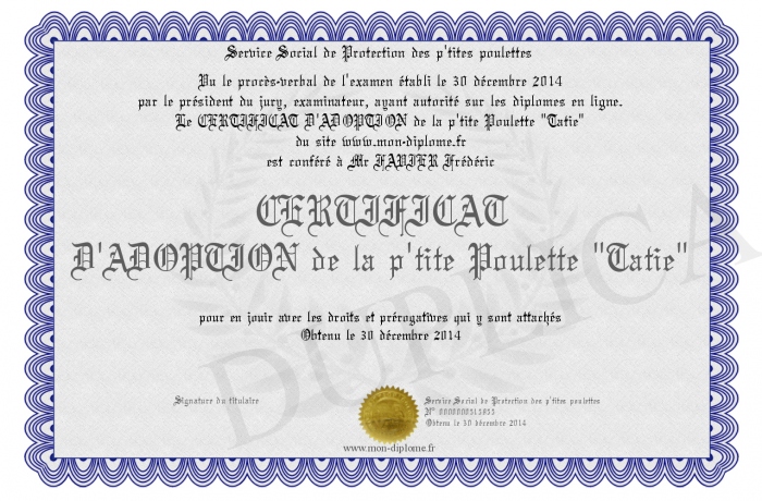 Envoyez par email votre CERTIFICAT D'ADOPTION de la p'tite Poulette -Tatie- personalisé