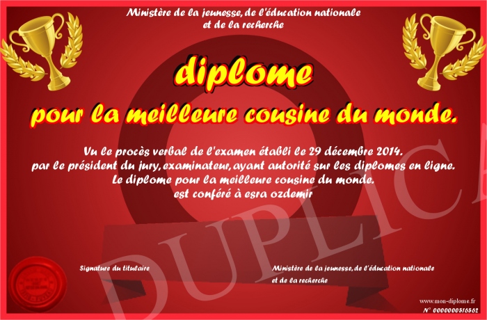 Envoyez par email votre diplome pour la meilleure cousine du monde. personalisé