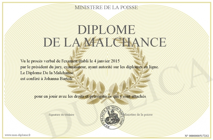 Envoyez par email votre Diplôme De la Malchance personalisé