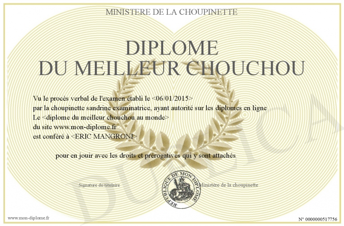 Envoyez par email votre Diplôme du meilleur chouchou personalisé