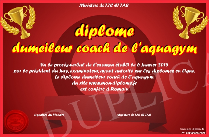 Envoyez par email votre diplome dumeileur coach de l'aquagym personalisé