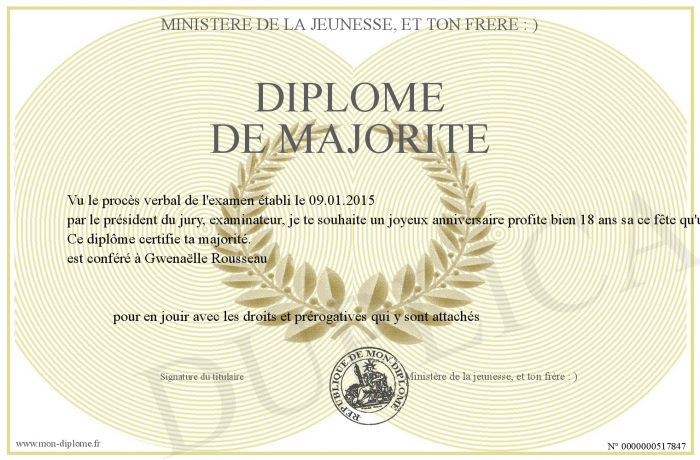 Envoyez par email votre Diplôme de majorité personalisé