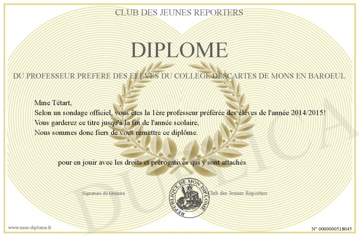 Envoyez par email votre Diplôme du Professeur préféré des élèves du collège Descartes de Mons en Baroeul personalisé