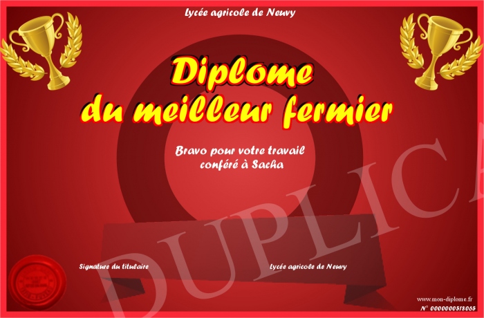 Envoyez par email votre Diplôme du meilleur fermier personalisé