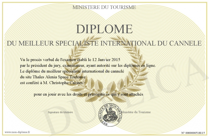 Envoyez par email votre Diplôme du meilleur spécialiste international du cannelé personalisé