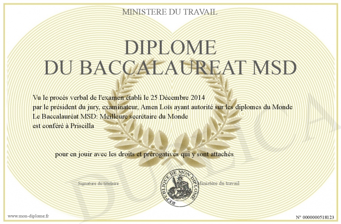 Envoyez par email votre Diplôme du baccalaureat MSD personalisé
