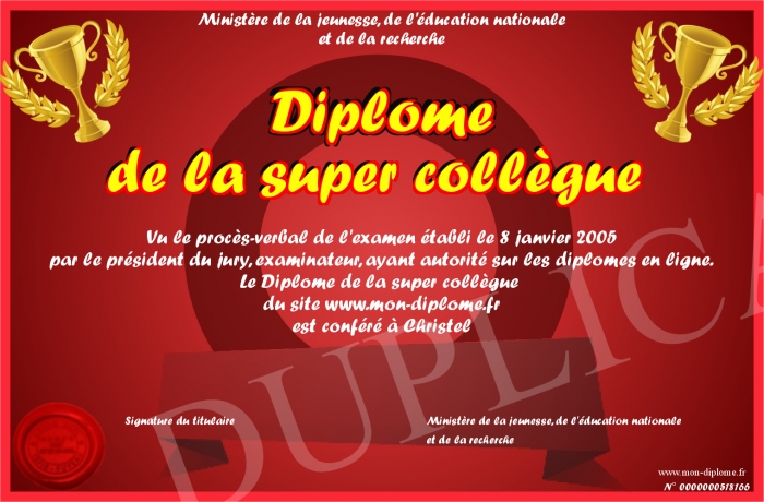 Envoyez par email votre Diplôme de la super collègue personalisé